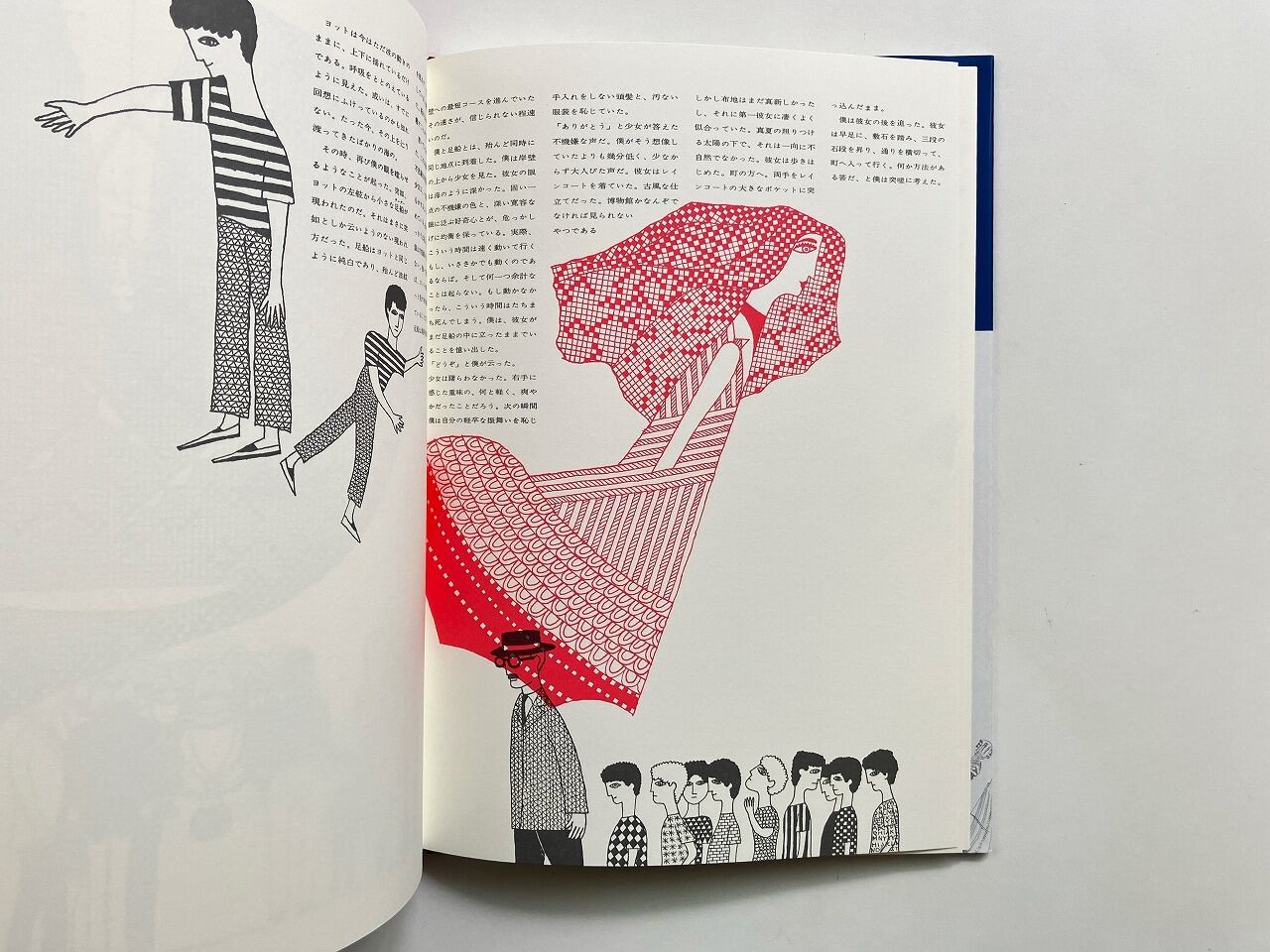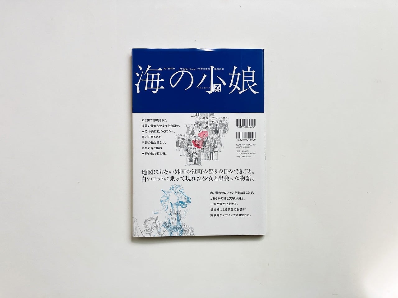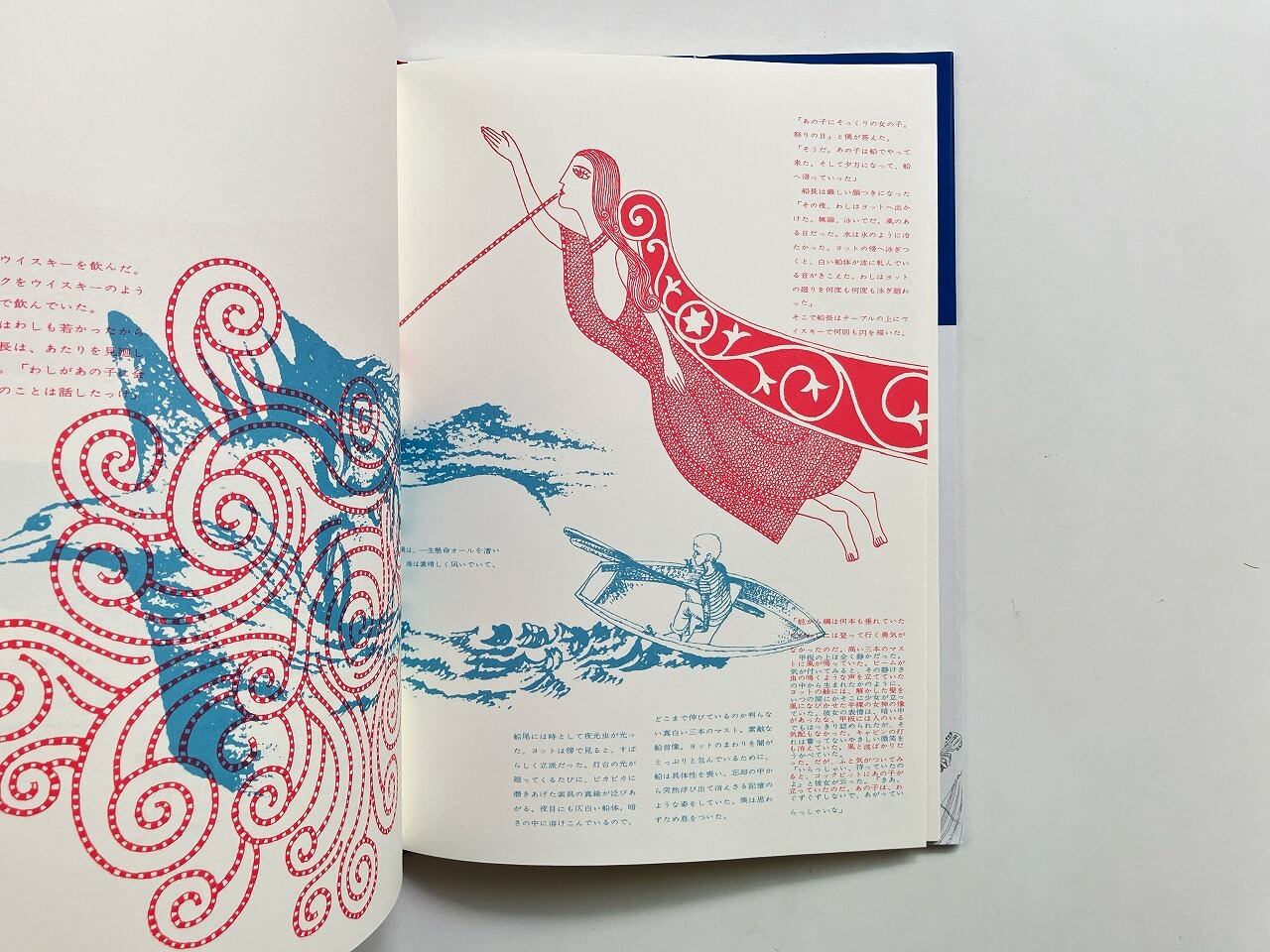 地図にもない外国の港町の祭りの日、白いヨットに乗って現れた少女と出会った物語。赤と黒で印刷された横尾のイラストレーションにはじまり、やがて宇野の青いイラストレーションと重なり、宇野のイラストレーションでお話は終わります。