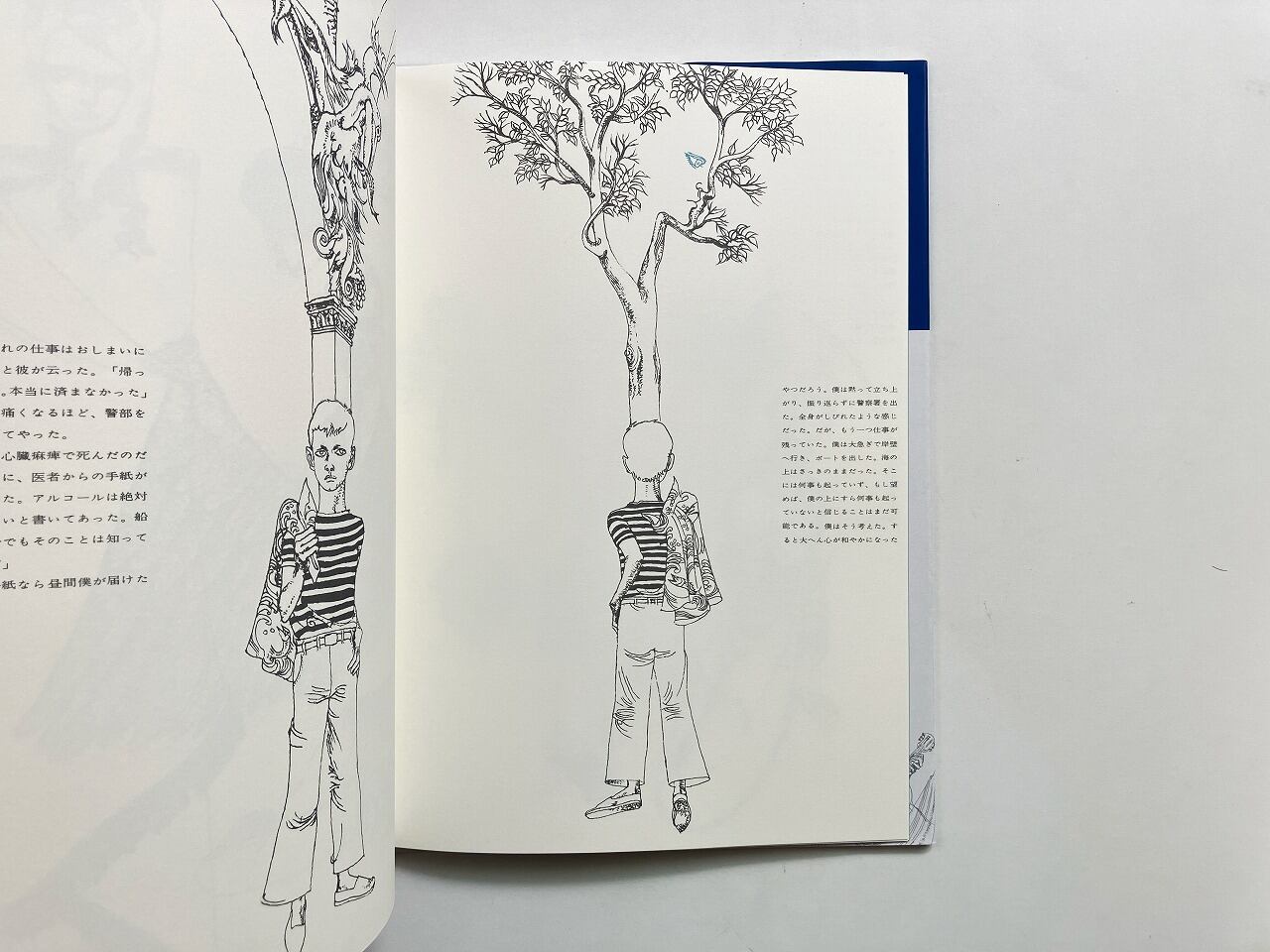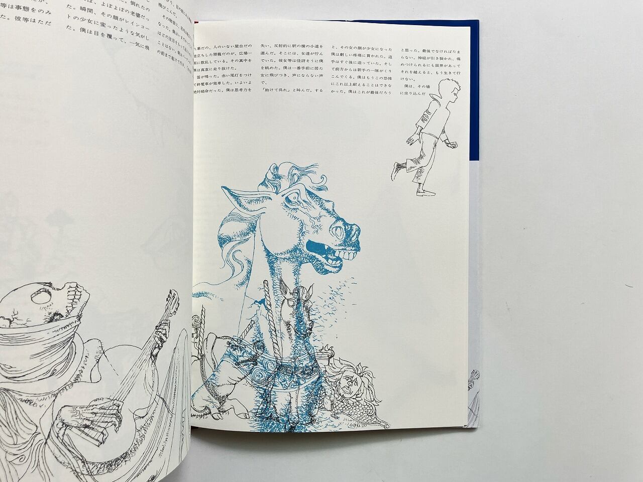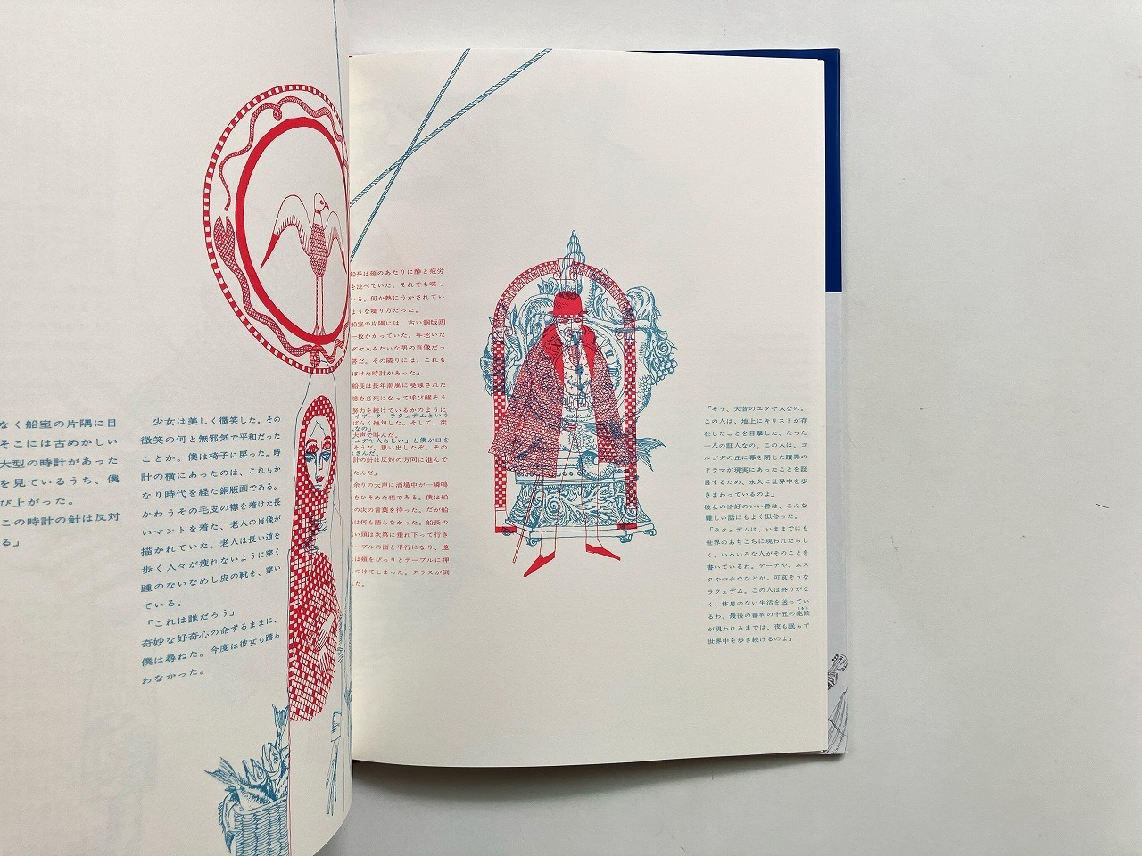 地図にもない外国の港町の祭りの日、白いヨットに乗って現れた少女と出会った物語。赤と黒で印刷された横尾のイラストレーションにはじまり、やがて宇野の青いイラストレーションと重なり、宇野のイラストレーションでお話は終わります。