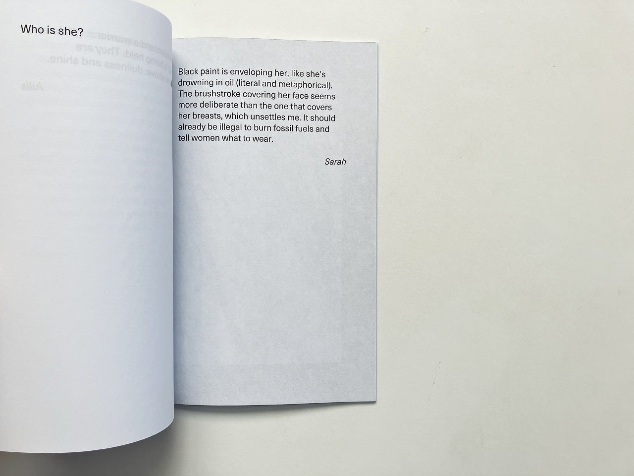本書は、看護師、ネイリスト、学生、フランス人観光客、ホームレスの薬物中毒者、図書館員、主婦、化学療法を受ける女性など、多様な背景を持つ女性たちに一枚の写真を見せ、その反応をまとめたもの。